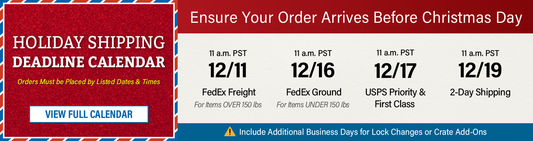 Any in-stock order received by 12 PM PST ships SAME BUSINESS DAY*, meaning if you need it fast, we'll get it to you, and we take extra care in packaging to ensure every order is delivered in PERFECT condition.