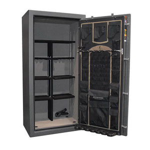 Inside, the DPX® Storage System provides flexible organization. The Quick Access DPX Barrel Rack holds 7 long guns on the door, with capacity for 16 more inside. Adjustable shelves at the top offer additional space for ammunition, valuables, and important documents.