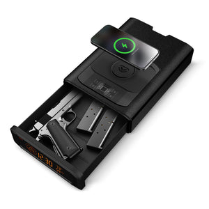 NEXT GENERATION SMART SAFE: Modern upgrades with a top mounted wireless charging pad, USB/USB-C accessory charging ports, and a sleek customizable LED display showing time/temperature/humidity make the ultimate modern home safe. Low profile safe design blends into its environment, great for RVs or nightstands. The auto-open safe drawer can secure a full size pistol (up to 9"), jewelry, small documents, and other personal belongings.