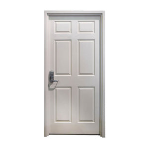 On the practical side, the V30 ships in a white primer coat, so you can paint it to match your existing trim or leave it as is. It is available in both 2-panel and 6-panel designs to keep the look consistent with your other interior doors, and it comes in right-hand or left-hand in-swing configurations. When installed in a wall with a minimum thickness of 4.5 inches, the door opens up to a full 180 degrees. It is designed to substitute directly for any standard 2'4" interior door, which keeps the installation straightforward.
