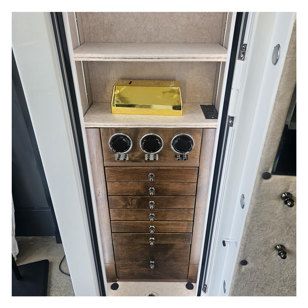 Setting a new standard in luxury security, the Fort Knox Marquise 6026 includes three built-in watch winders — a first in Fort Knox’s lineup. Designed for collectors, these precision winders protect your timepieces while keeping them powered and ready to wear. This innovation makes the Marquise 6026 one of the most exclusive and forward-thinking jewelry safes on the market today.