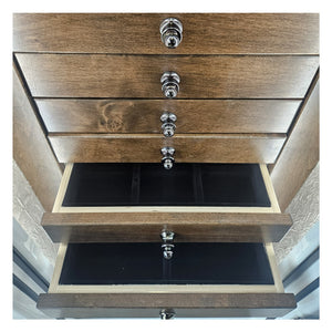 Finished in a Brilliant White Gloss exterior accented with Black Chrome hardware, the Marquise 6026 elevates the look of any space. Inside, a luxurious Sand Velour interior and cabinet-style bottom offer both beauty and organization. Six plush velvet-lined drawers, including a dedicated file drawer, provide secure and elegant storage for fine jewelry, watches, and personal valuables.