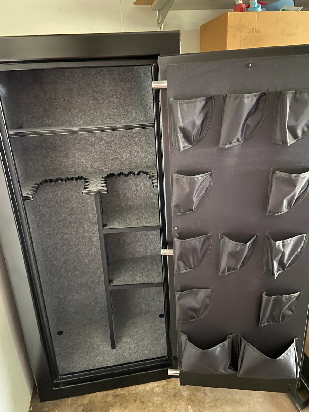 Not a very extravagant or complex safe but completes its purpose with class. Sturdy build. Spacious enough for me, but may be tight for 20+ guns with rifle attachments/lights/scopes.Solid handle. Ordered lockdown puck so got a live tamper/alarm system with temperature and humidity monitoring. Dean Safe very good at responding to questions and rectifying any issues. (Lockdown puck wasn’t sent in package claimed as containing it; this was resolved in one quick phone call and couple days shipping)