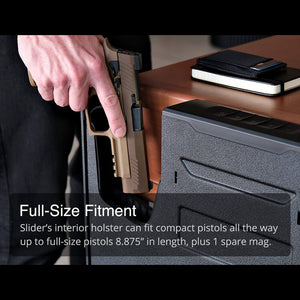 The Vaultek SL2e Essentials Slider is engineered for firearm owners who demand speed and discretion. Its slim, vertical design allows it to fit where traditional safes cannot—under a desk, on a bookshelf, or discreetly inside a vehicle. When seconds count, the signature three-point precision rail system deploys your firearm smoothly and silently in fractions of a second.