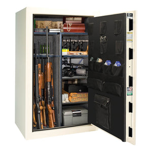 On the inside of the door of the safe comes a deluxe door storage panel. On the Door panel comes sewn in pistol holsters and multiple storage pockets. The fully upholstered Flex adjustable interior comes with shelves and gun storage racks. The entire interior is lined with carpet to protect your valuables from scratches.
