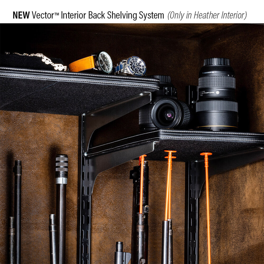 The Rhino KSX5933 now comes with Rhino's NEW Vector™ Interior. This Vector™ System uses the back wall of the interior to adjust your interior shelving and gun rack, which allows you to maximize storage space inside your safe. This new system is fully adjustable to fit your needs and provide ultimate flexibility. The entire interior is fully upholstered and comes with Rhino's silver heather interior carpet lining.